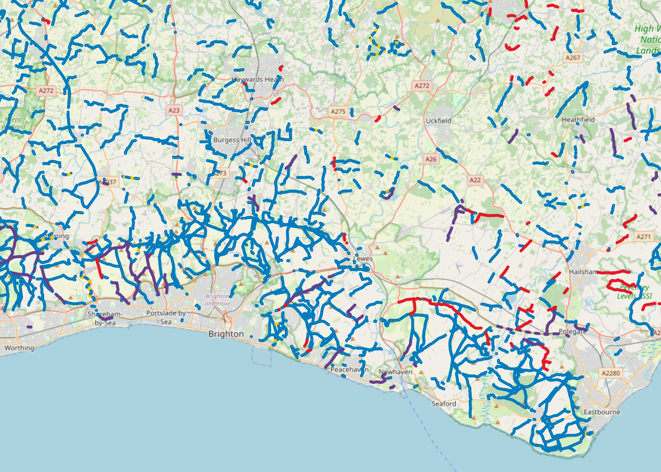 Sussex as a county is approximately 100 miles wide and 40mile high. Sussex also has a network of 2000 miles of public rights of way (in East Sussex alone). Public rights of way are Footpaths, Bridleways and Byways that link to slower roads throughout the county.